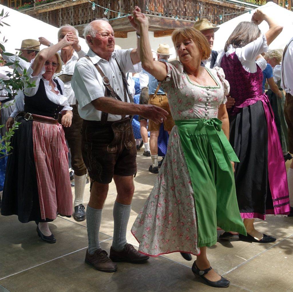 Volkstanz mit einfachen Tanzformen, jeder kann mitmachen, Tänze werden gezeigt.